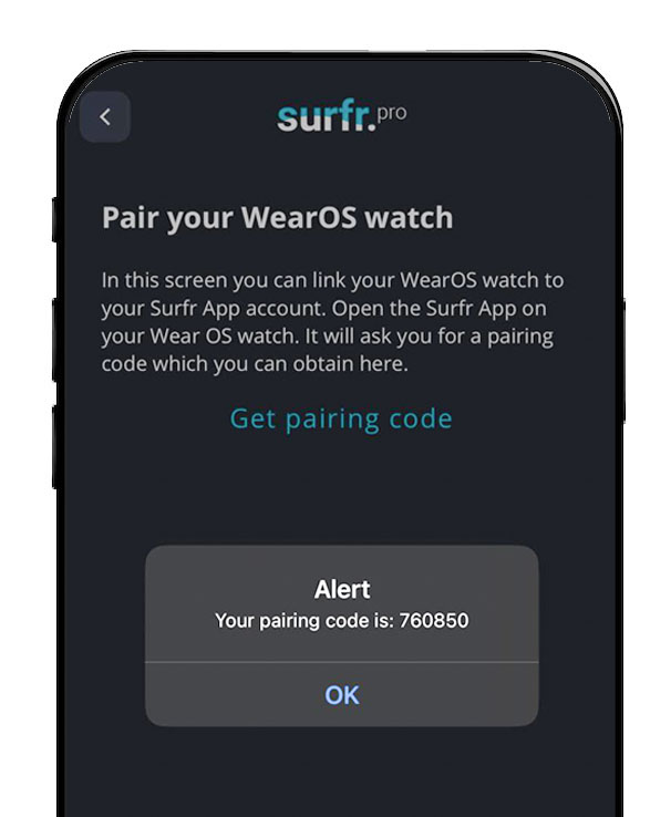 Now, open the Surfr app on your watch and follow the setup instructions. When prompted, enter the 6-digital code from your phone to complete the pairing.